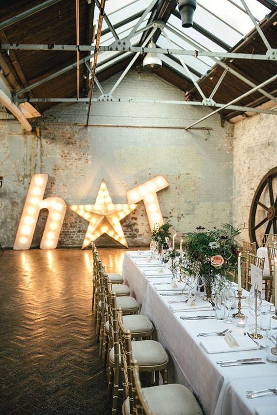 Espacios que se puede creer que tengan poco encanto, pero con los accesorios decorativos y con la paleta de colores adecuada, puede ser un lugar de lo más romántico para darse el sí quiero. ¿Qué te parece una inmesa pared con unas letras luminosas con vuestras iniciales o la palabra love como escenario ideal para vuestro primer beso de casados? Además, en el resto de la decoración no pueden faltar las mesas de madera interminables, sillas de madera vintage, lámparas de metal, sofás estilo chester, viejos palés o bobinas de madera a modo de mesas para el cóctel o accesorios en tonos dorados, blancos o rosas empolvados. Y es que esa belleza en bruto y esa decadencia es lo que otorga el encanto a estos sitios. Desde antiguas naves a almacenes, pasando por fábricas, silos o estaciones de tren que ya hace años que no tienen vida.