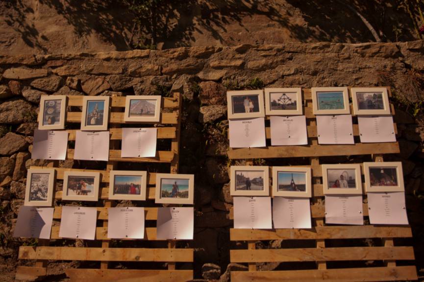 La decoración floral destaca por su sencillez, con con paniculata y anastasias en tonos amarillos para los centros de mesa. Y el resto de detalles estaban pensados para personalizar y sorprender a los invitados con pedacitos de la historia de amor de Sabrina y Paco. "Somos muy viajeros, nos encanta, así que decidimos hacer un seating plan con fotos nuestras en los sitios donde habíamos estado. Cada mesa era una ciudad", continúa Sabrina. "Como libro de firmas, hicimos un recopilatorio con fotos de cada invitado, intentando que apareciésemos nosotros con ellos en algún momento especial compartido, así durante el baile los invitados se buscaban, se sorprendían mucho al verse y nos dejaban impresos sus mejores deseos".